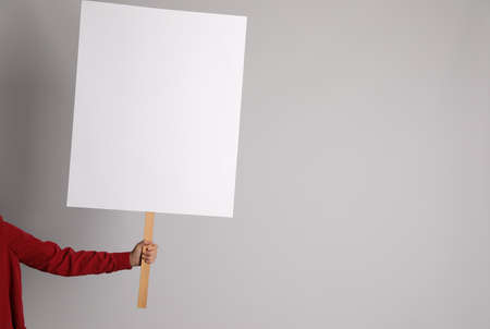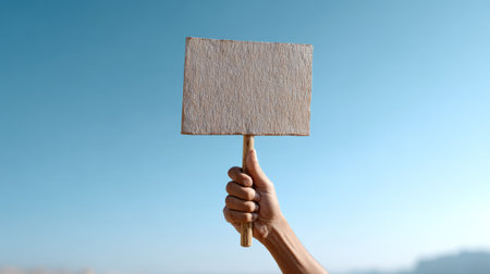 Hand gripping a blank protest sign against a vibrant blue sky, representing freedom of speech and the determination for social change and activism in the fight for justice and equality