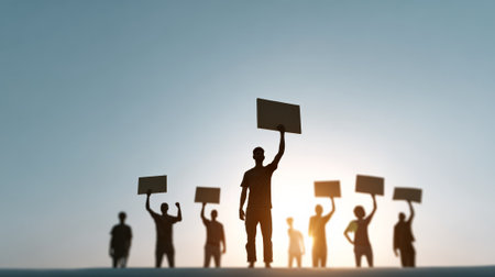 Silhouetted activists are holding blank signs and raising their fists during a peaceful protest at sunset, demonstrating their commitment to social justice and human rights