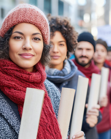 Public demonstration on the street against social problems and human rights. Group of multiethnic people making public protest