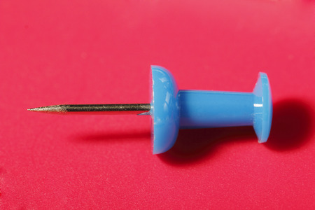 Blue Push pin on Red Background closeup