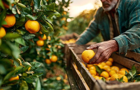 Mature farmer's hand picking ripe oranges from a tree into a wooden crate at sunset