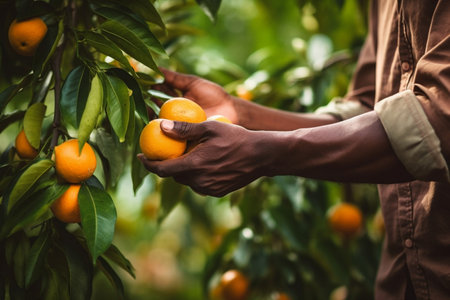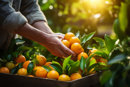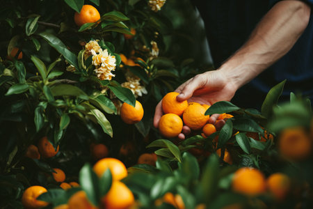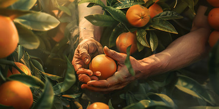 Business farm ripe orange concept farmer hand pick nature fruit citrus orchard mandarin tree growing organic lush leaves background green vibrant garden crop leaf laden branches plant close up growth