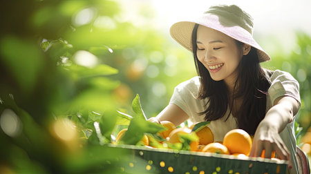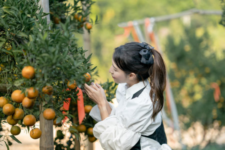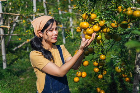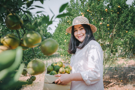 Asian middle age woman gardener picking organic orange in a orange orchard, harvesting ripe orange crop. Agriculture harvesting and plantation concept.