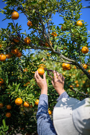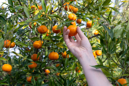 Close up of a female hand plucking a ripe mandarin from a leafy branch in a sunlit citrus orchard. Concept of organic harvest, fresh produce, healthy food and seasonal farming