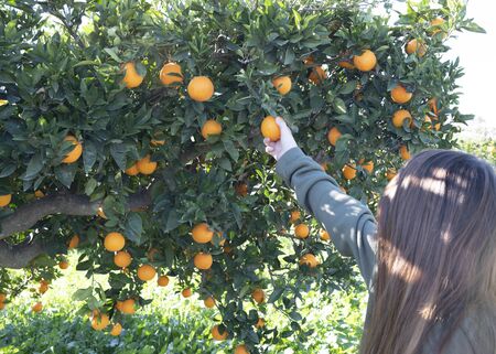 woman hand picking ripe oranges on tree in Orange plantation