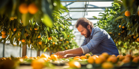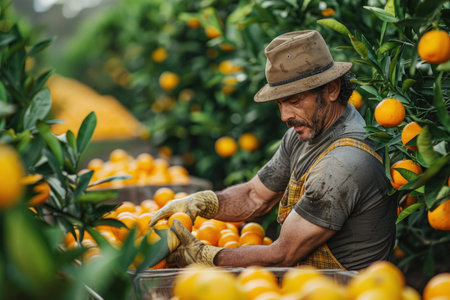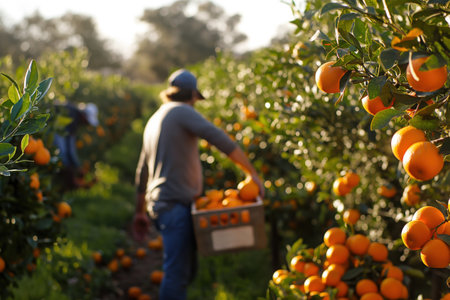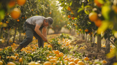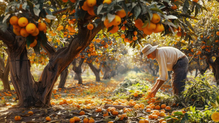 A dedicated man collects ripe oranges in a sunlit citrus orchard, surrounded by lush trees and vibrant fruit. This serene scene captures the essence of traditional farming and seasonal work.