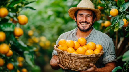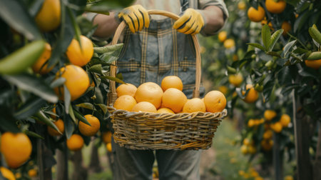 A dedicated farmer collects freshly picked oranges in a woven basket while surrounded by lush orange trees in a vibrant citrus grove. Bright colors showcase the harvest season.