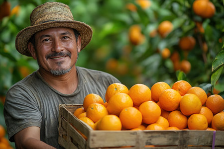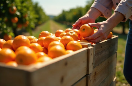 farmer holds ripe oranges in wooden crate, citrus fruits, harvesting concept.