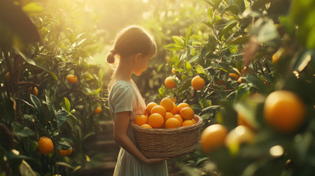 A girl with a wicker basket full of oranges, standing in a vibrant garden surrounded by fresh greenery and sunshine.