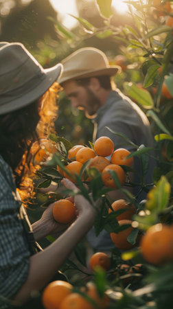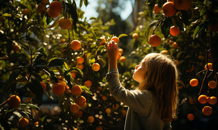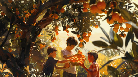 A family picking oranges from a tree, capturing a joyful moment of togetherness and the bounty of nature
