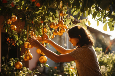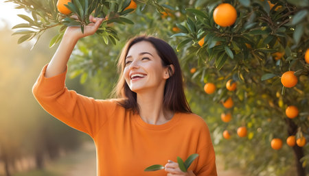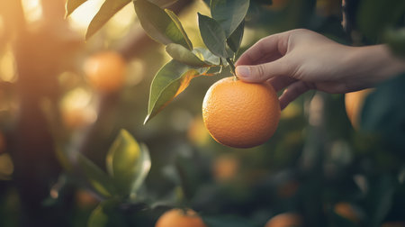 A person reaching for a ripe orange in a lush orchard, symbolizing the joy of harvesting fresh fruit surrounded by vibrant green leaves and warm sunlight.