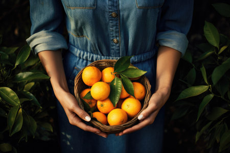 An individual holds a basket filled with oranges, showcasing the vibrant citrus fruits, Female farmer with hands holding freshly harvested mandarin oranges, AI Generated
