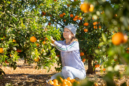 Positive skillful middle-aged woman farmer in plaid shirt harvesting fresh mandarins in orchard on sunny day