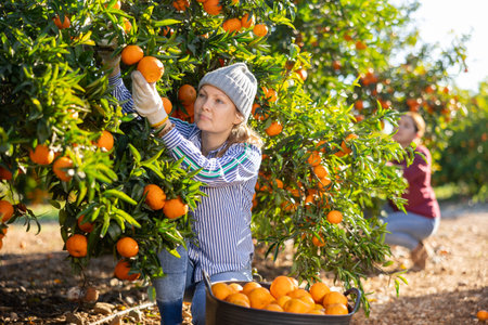 Young woman farmer plucks tangerines, putting fruit in a busket