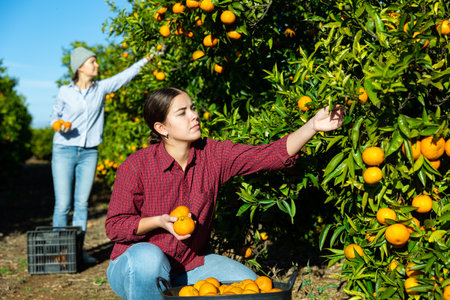 Skilled young woman farmer employee in plaid shirt harvesting fresh tangerines during work on farm during daytime