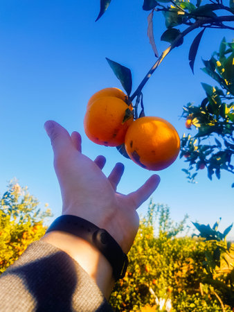person picking fruit from an orange tree in the beautiful countryside of andalucia copy space in the background