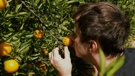Man sniffs a fresh, ripe tangerine on a branch in a lush green garden