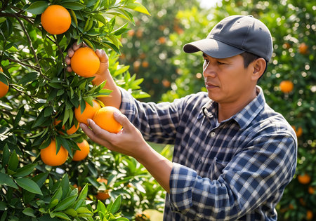 A man wearing a plaid shirt and a baseball cap is shown in an orange grove, carefully picking ripe oranges from a tree. The sunlight filters through the green leaves, illuminating the vibrant orange fruit. The background is softly blurred, suggesting a vast orchard.