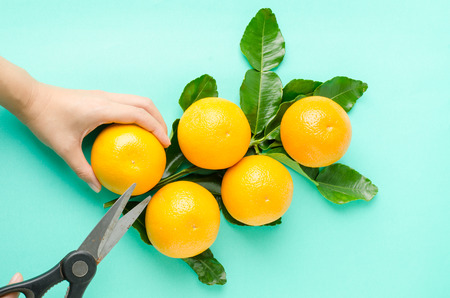 Womens hands pick juicy tasty oranges from a tree in the garden.