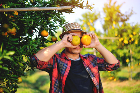 A man wearing a grey cap and a blue plaid shirt is in an orchard, carefully picking ripe oranges from a tree. The branches are laden with green leaves and bright orange fruits. The background shows more trees and a sunny, outdoor setting.