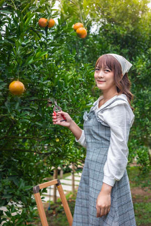 Young woman ardener is dress for harvest gardening organic orange tree and uses scissors and stairs to cut the oranges on the trees in the garden. Farmer concept working in the garden happily