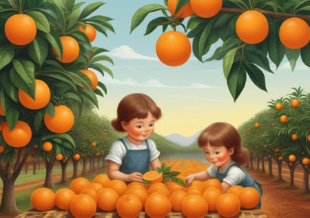 Children picking oranges in the orange garden, 3d rendering. Computer digital drawing.