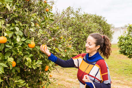 Caucasian farmer woman picks oranges on the orange tree in the garden.