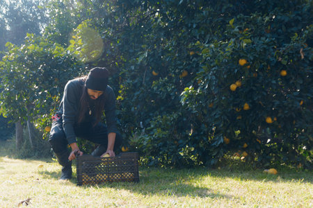 Adult Man in the field working is crouching down arranging the fruits in the basket, he is harvesting fresh oranges, there is a big orange tree next to him, copy space