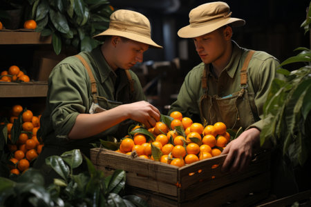 Two workers carrying crate of oranges at warehouse. agribusiness concept.
