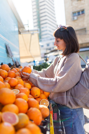 A beautiful young woman selects oranges at a grocery market. A brunette in casual clothes shops at the bazaar. Healthy eating concept.