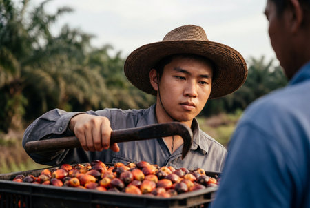 Young Asian male farmer wearing brown hat and grey shirt, holding dark wooden handle, inspecting palm fruits in crate, agricultural work and harvesting concept