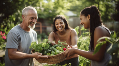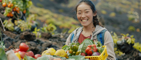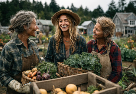 Three female farmers are smiling and holding baskets of fresh vegetables in a lush garden, surrounded by greenery and rustic farm structures, celebrating community and nature