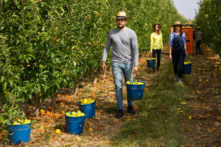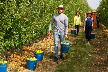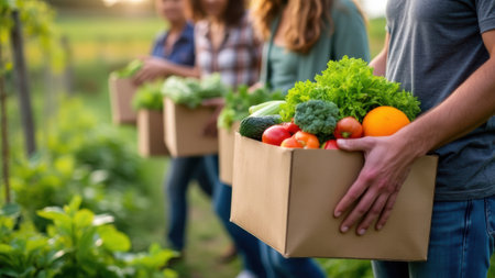 Group of farmers walking and carrying boxes full of fresh organic vegetables after harvest on a farm