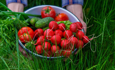 a man holds a bowl of fresh vegetables from the farm in his hands. Nature. Selective focus