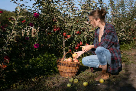 Young woman farmer harvesting ripe peaches in fruit garden