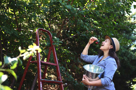 Pleasant woman eating cherry berries while picking ripe cherries in backyard garden during summer harvest. Agriculture