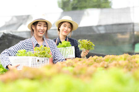 Owner farmer working and care vegetable or nurse growth plants Hydroponic organic in greenhouse. Asian family women gardener in agriculture industry. Hydroponic agricultural system. Business small concept