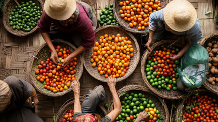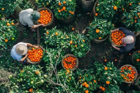 workers gathering mandarine trees harvest in the garden drone view