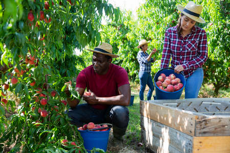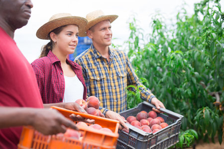 Woman farmer with male partner harvesting ripe peaches in fruit garden