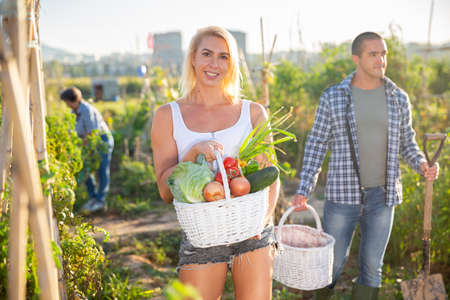 Smiling young blonde with harvested vegetables in home garden