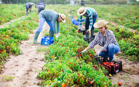 Hispanic farmer harvesting tomatoes on farm field