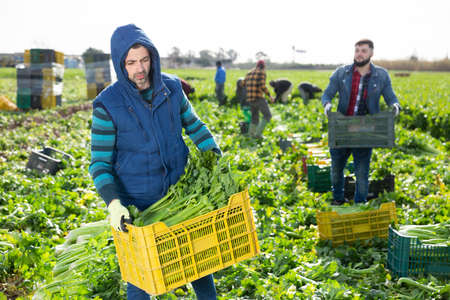 Farm worker carrying crate with celery