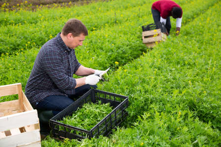 Confident worker harvesting green mizuna