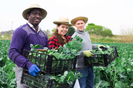 Cheerful multiracial farmers with fresh vegetables in boxes on plantation