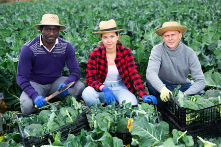 Group of farmers posing with freshly harvested broccoli at farm
