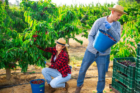 Team of farmers harvest cherries and store them in crates