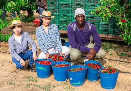 Team of farmers posing with harvested cherries