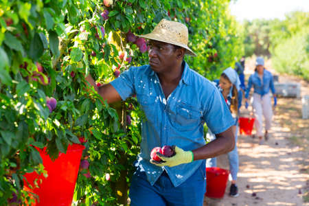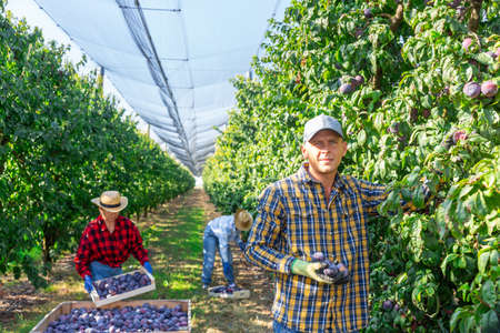 Man farm worker gathering harvest of ripe plums