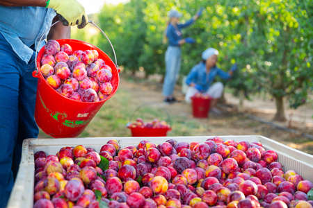 Gardener filling box with freshly picked plums during harvest