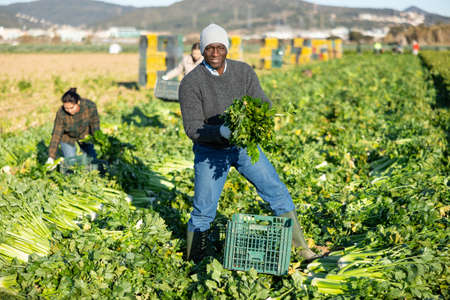 Plantation worker picking ripe green celery
